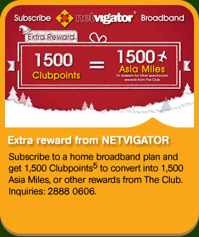 Limited time promotion. This Offer is applicable only to new NETVIGATOR customers who, registering with their Hong Kong Identity Card, have subscribed to designated NETVIGATOR broadband service plans at designated locations with a commitment period of at least 24 months (Not applicable to customers registering with passport or business registration certificate) and agreed to pay via credit card, and the NETVIGATOR broadband service must be successfully been completed within 30 days from the date of application; The customers (with the same NETVIGATOR customer name) must be registered members of The Club, operated by Club HKT Limited and this offer is subject to relevant terms and conditions. Customers need to apply for auto-conversion of Clubpoints to Asia Miles (100 Clubpoints=100 Asia Miles) by themselves.