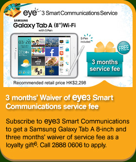 Customer must successfully install and use the eye3 Plan continuously for 27 months (“Commitment Period”) in order to get the Samsung Galaxy Tab A 8” (“eye3 Device”) as a loyalty gift and entitle the monthly rate rebate for 3 months. The rebate will be made in the 4th, 7th and 13th month and credited to customer’s Fixed Line Service account. For details, please visit our website at www.hkt-eye.com/eye3/chi/plan.php. Customer can terminate the contract by giving us a 30 days’ prior written notice, but if the Customer terminates before the expiry of the Commitment Period, the Customer will be liable to pay to the Company (i) HK$1,700 and (ii) an Early Termination Charge of eye3 Plan (for an amount equal to the aggregate of the Monthly Rate within Commitment Period for the remaining period from termination up to expiry of the Commitment Period or HK$500, whichever is higher). If the Customer terminates the eye3 Plan or the eye3 Plan is terminated due to any breach of the terms and conditions by the Customer prior to the expiry of the Commitment Period, all offer privileges under the eye3 Plan will cease immediately from the date of such termination. In addition, Customer upgrading from RTL to eye3 Plan will no longer enjoy any existing RTL Service Plan offers from the commencement date of the eye3 Plan. The Company may amend or terminate the contract at anytime, but if it causes the Customer’s material disadvantage or if it results in an increase in the Customer’s monthly charges the Customer has a right to terminate without incurring any early termination charges. This service plan is only available to selected areas and residential buildings. Other eye3 service plans and eye3 devices are also available, please call our hotline for further details.