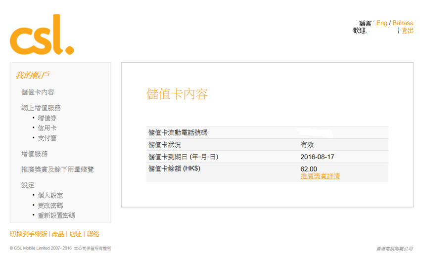 2. 登入「我的賬戶」(prepaid.hkcsl.com) ,輸入儲值卡電話號碼及 密碼即可查詢