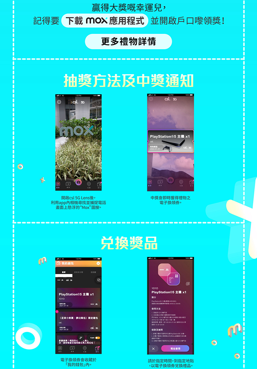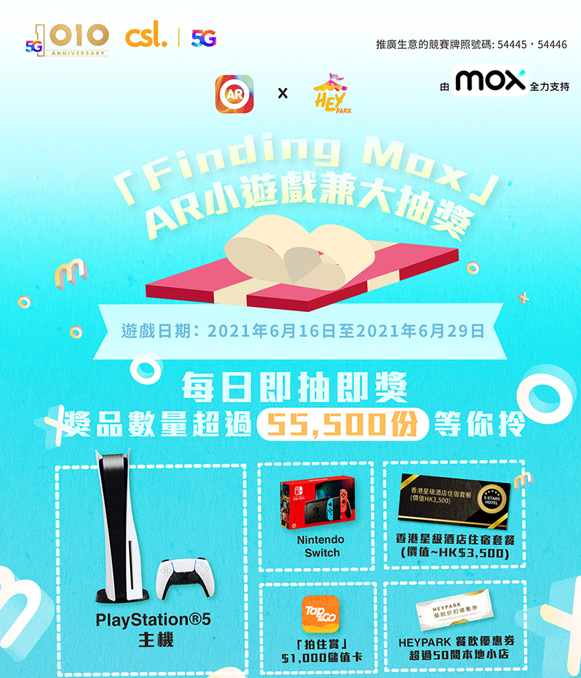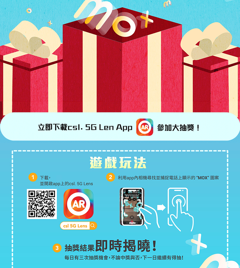 參加者需要在推廣期內利用 csl. 5G Lens 開啟「Finding Mox」遊戲,尋找並捕捉 “m”、“o”、“x” 圖案。每一次成功捕捉 “m”、“o”、“x” 圖案即代表一次抽獎的機會。獎品列於遊戲頁面(「獎品」)。每次抽獎結果將於 csl. 5G Lens 應用程式內公佈。 |