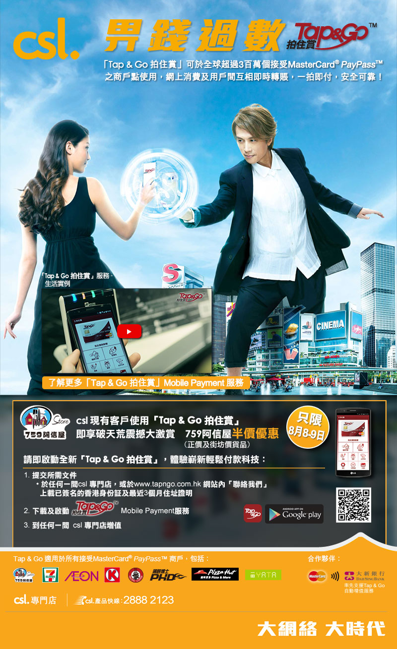 拍住賞付款服務只適用於csl 月費服務客戶,並使用具NFC 功能之指定手機。拍住賞付款服務受HKT Payment Limited 的條款及條件約束,詳情請參閱www.tapngo.com.hk。 |