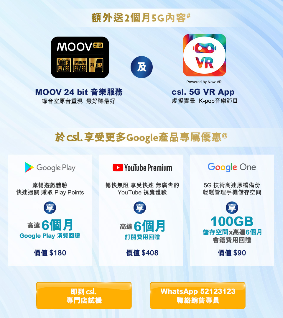 5G Android 震撼賞條款及細則 客戶需要於2020年5月1日至2021年 1月31日期間,成功啟用流動電話服務合約。相關指定手機會不時更新,詳情請參閱本公司網站。 YouTube Premium 消費回贈、Google One 消費回贈 、Google Play 消費回贈, 統稱『回 贈』。 此消費賞的回贈只適用於使用csl賬單付款服務支付Google Play內容的相關消費。 |